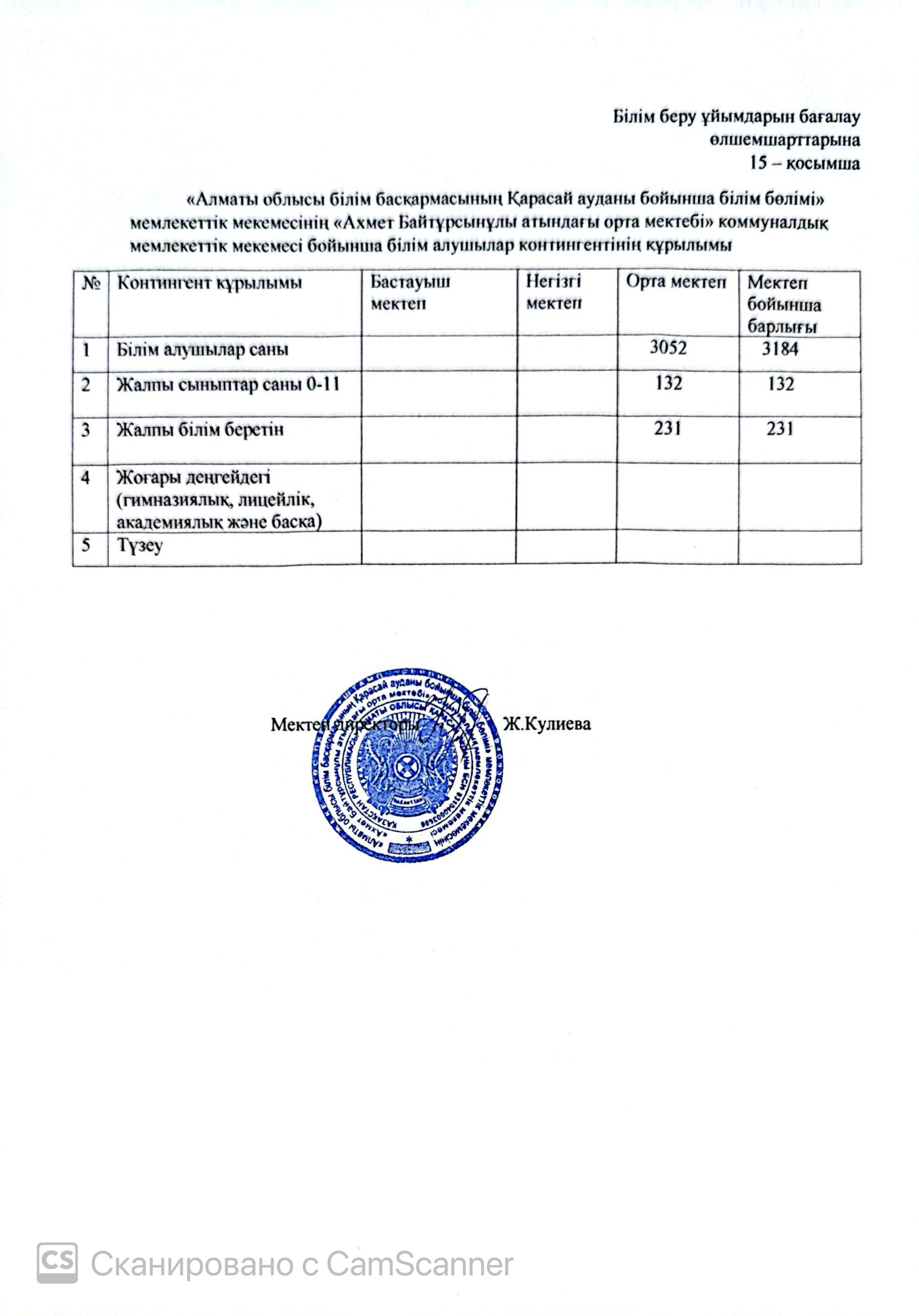 Білім алушылар контингентінің құрылымы 15-қосымша » "Ахмет Байтұрсынұлы атындағы орта мектебі" КММ